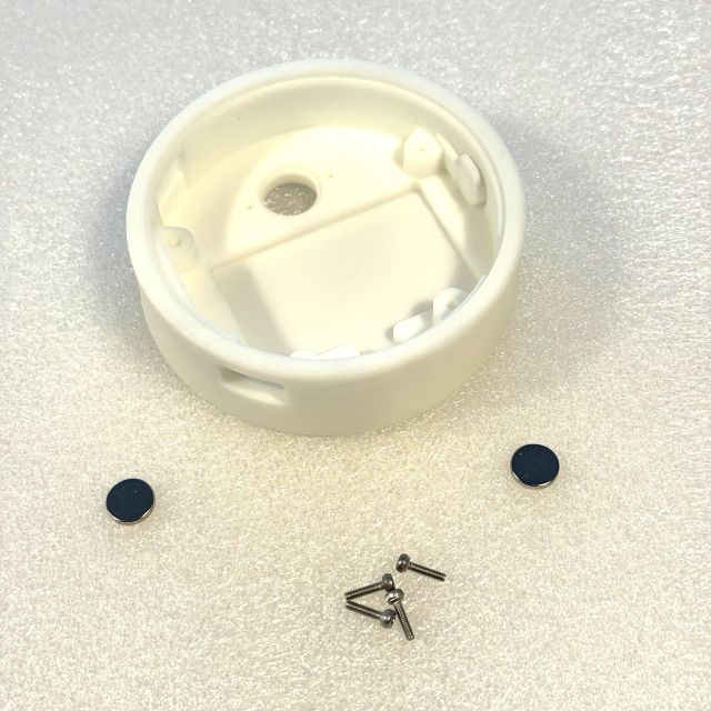 Het ronde touch display past perfect in deze professioneel 3D geprinte resin behuizing. Aan de zijkant is een drukknop in het ontwerp verwerkt. Er is ook plaats voor de accu. Met schroefjes en twee magneetjes voor een stabiele ligging op de puck dock. Direct na het lijmen van de magneetjes het display op de het dock zetten, dan orienteren de magneetje zich vanzelf.