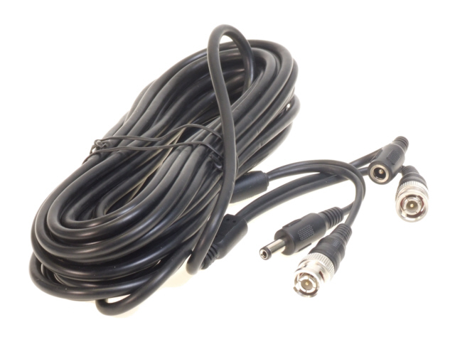 10 meter RG59 coax/voeding verbindingskabel met reeds gemonteerde BNC connectoren en voedingspluggen. Het beste beeld zonder storing door gescheiden kabels voor videosignaal en 12V voeding.