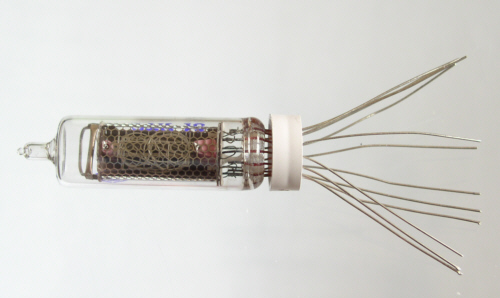 Russische nixie buis type IN16, ongebruikt. Hoogte buis inclusief nippeltje circa 42mm, cijferhoogte circa 12mm. Diameter 12,5mm. 13 aansluitdraden. Zowel een linkse als een rechtse decimale punt. Met plastic tussenring van 5mm. Totale hoogte inclusief ring circa 46mm.